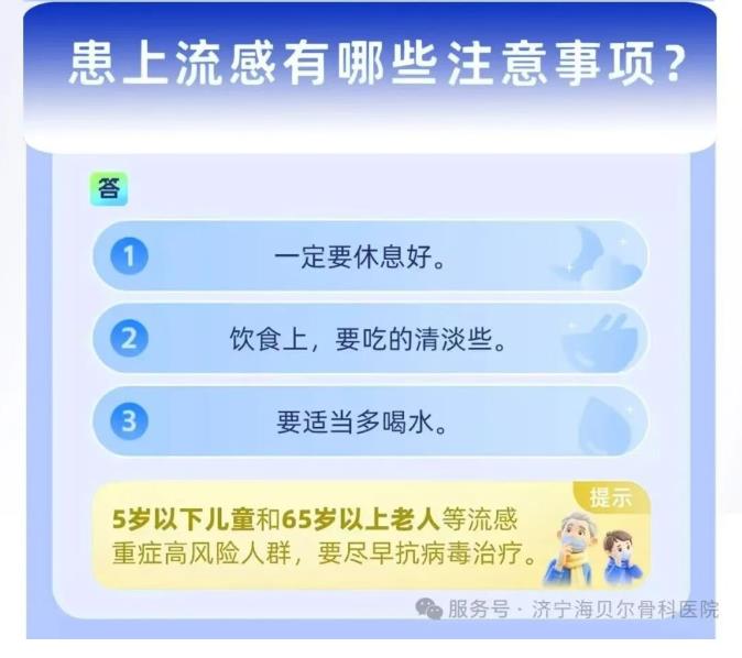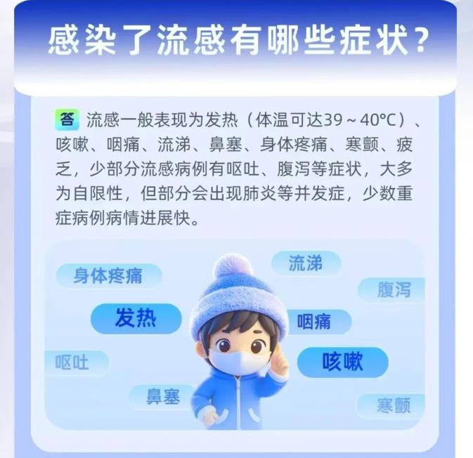 流感:起病急,症状重,典型表现包括:高烧:体温迅速升至 39℃~40℃,常伴有畏寒、寒战;全身酸痛:头痛、肌肉痛、关节痛明显,尤其是背部和四肢;乏力倦怠:感觉极度疲劳,甚至影响正常工作与生活;呼吸道症状:咽痛、干咳,部分患者可出现胸痛;消化道症状:少数人会出现腹痛、呕吐、腹泻等。流感属于自限性疾病,多数健康人群 1~2 周可自行恢复,但对于老年人、儿童、孕妇及慢性病患者等高风险人群,可能引发肺炎、心肌炎、呼吸衰竭等严重并发症,甚至危及生命。 流感如何传播?这些途径需警惕流感病毒主要通过以下方式传播:飞沫传播:患者咳嗽、打喷嚏时喷出的飞沫可在 1 米范围内直接传播;接触传播:触摸被病毒污染的门把手、电梯按钮、手机等物品后,再触摸口、鼻、眼而感染;气溶胶传播:在密闭、通风不良的空间(如电梯、会议室、交通工具内),病毒可长时间悬浮于空气中,增加吸入风险。因此,在人群密集或通风较差的环境中,更应提高警惕。 哪些人是重症高风险人群?以下人群感染流感后发展为重症的风险较高,需特别加强防护:60 岁及以上的老年人;5 岁以下的儿童,尤其是 2 岁以下婴幼儿;孕妇及产后两周内的女性;患有慢性基础疾病者,如高血压、糖尿病、心肺疾病、免疫功能低下者;长期卧床、行动不便的骨科术后康复患者。如果您或家人属于上述群体,请务必重视流感预防。 预防流感,这几点很关键面对流感,我们并非束手无策。采取“疫苗+卫生习惯”双防线策略,能有效降低感染风险。