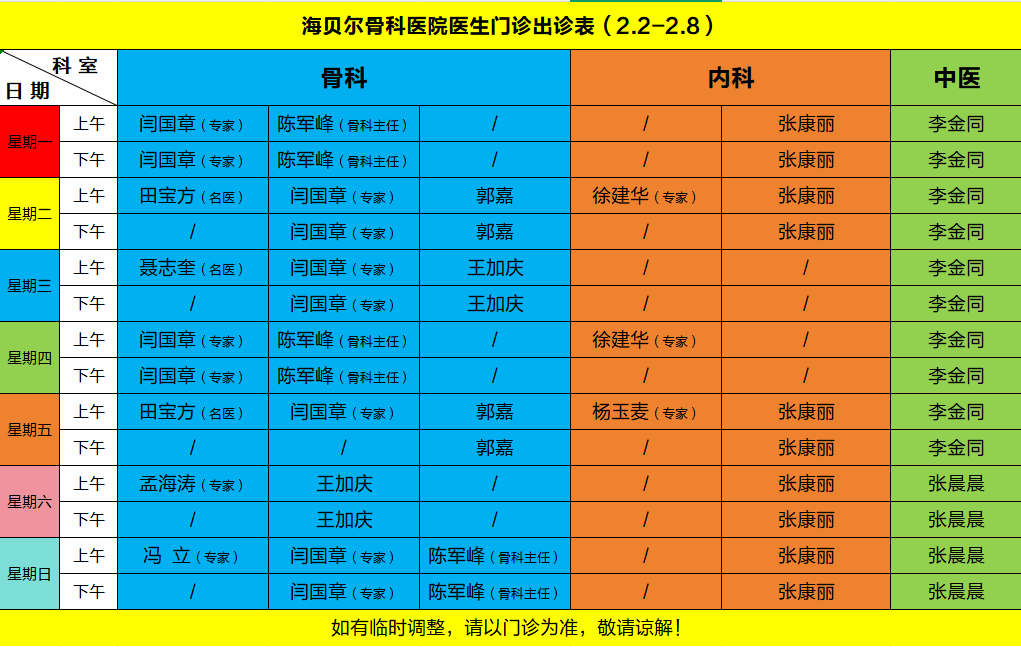 海贝尔骨科医院医生门诊出诊表(2.2-2.8)