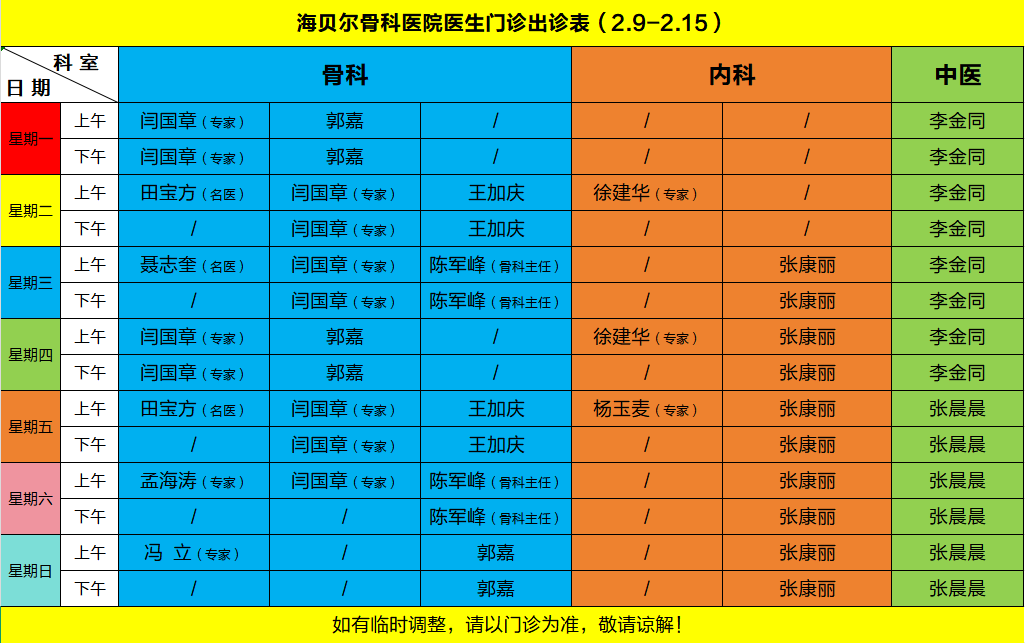 海贝尔骨科医院医生门诊出诊表(2.9-2.15)