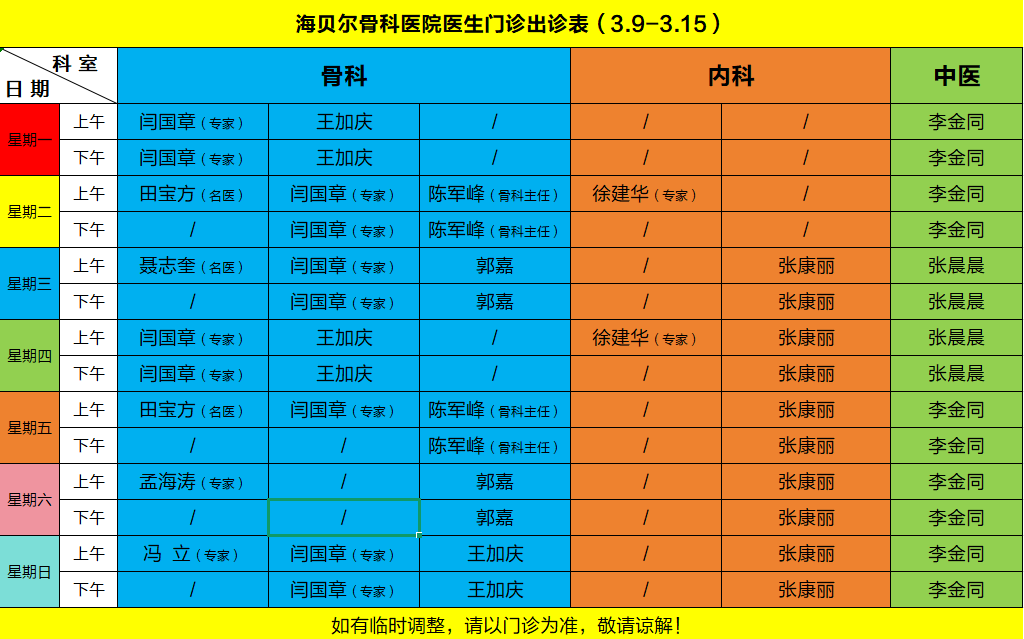 海贝尔骨科医院医生门诊出诊表(3.9-3.15)