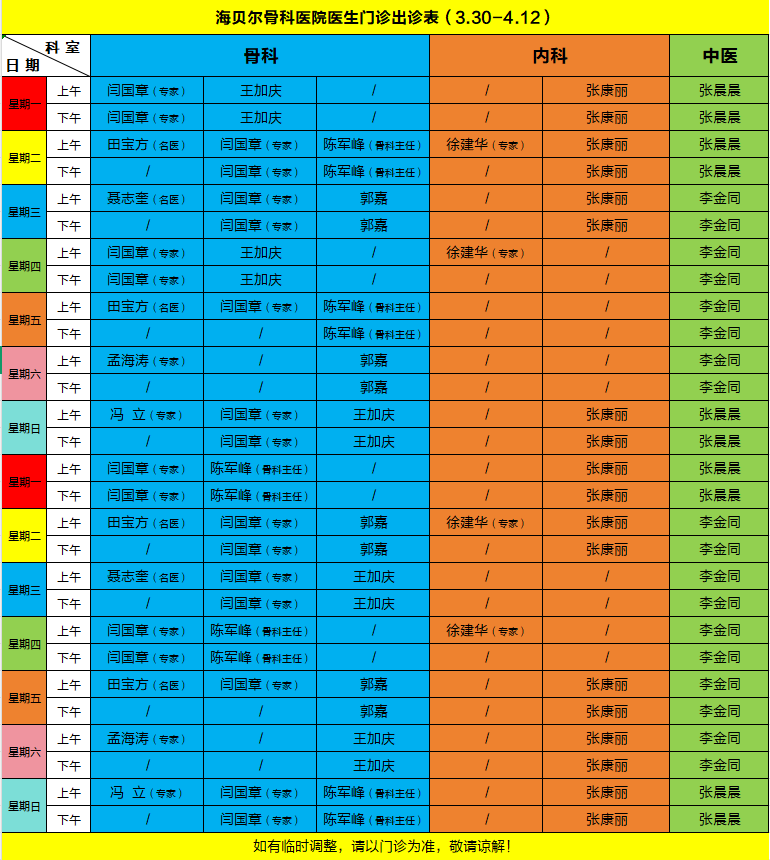 海贝尔骨科医院医生门诊出诊表(3.30-4.12)